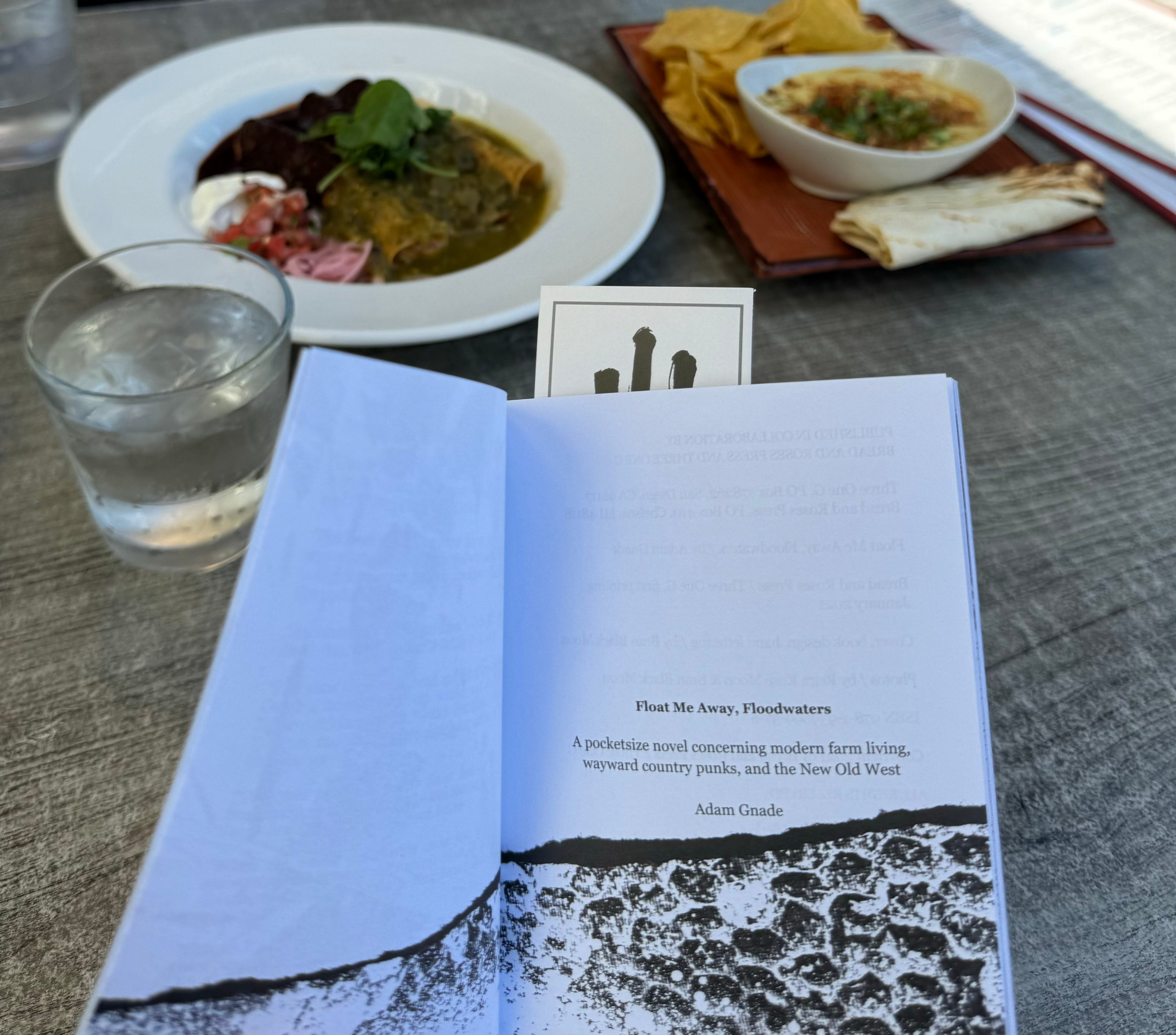 This year, the culprit is Adam Gnade, whose artist’s statement begins with “[m]y goal as an artist is to create a personal history of America, to tell how it was to live when I lived, to show the ugly, the beautiful, and the things we don’t always see.” Gnade’s Float Me Away, Floodwaters, a $10 “pocketsize novel concerning modern farm living, wayward country punks, and the New Old West” was my introduction to his work. It caught my eye as I was leaving Trident Booksellers and Cafe, an indie bookstore in Boulder, CO, because the book was so physically small and stood out from the other books in a display highlighting independent publishers. I was on my way to the airport and needed something portable and easily readable to keep me company on a couple of short flights. I flipped it open, skimmed a few lines that dropped me into Gnade’s America, and decided it was good enough reading for the next few hours.